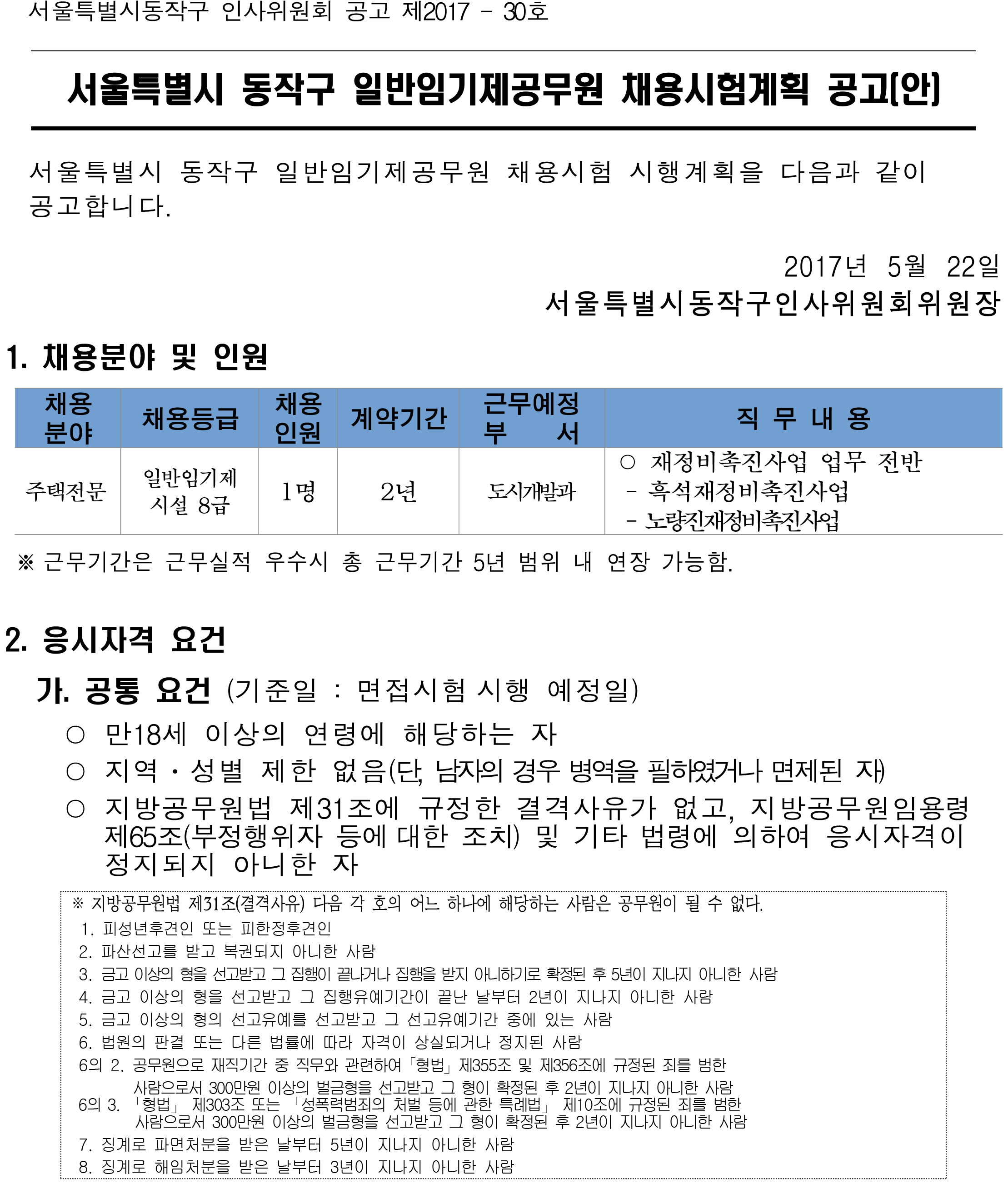 2017 서울시 동작구 일반임기제공무원(주택전문) 채용시험계획 공고(안) 안내